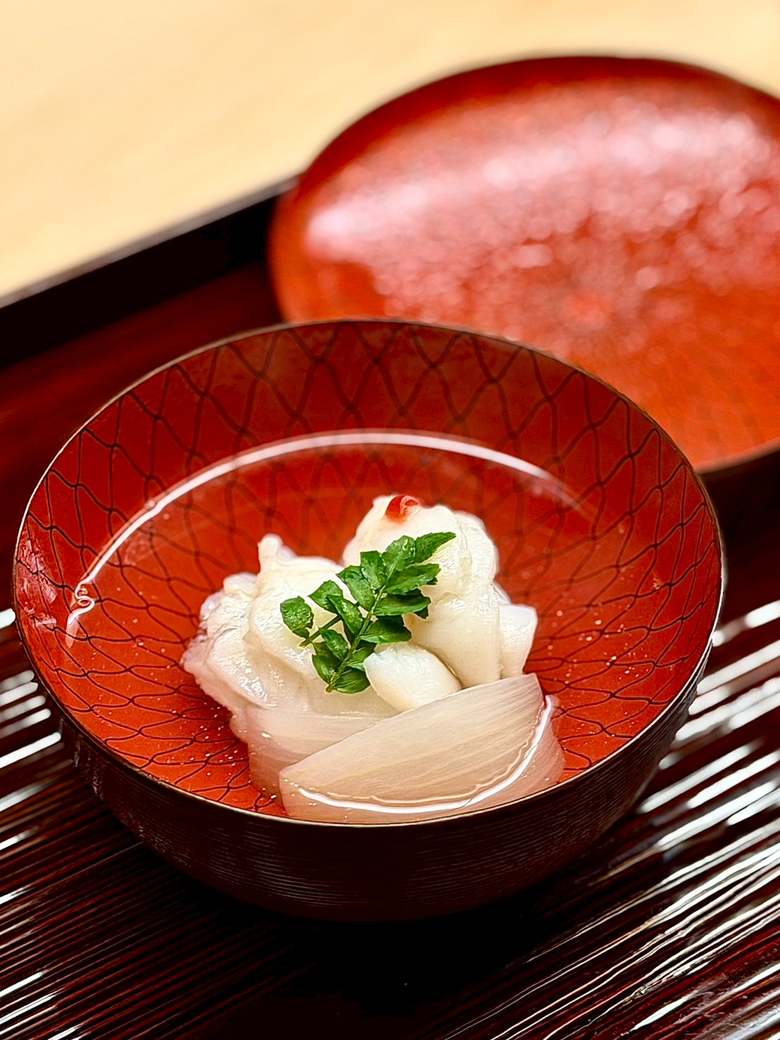 他的割烹不靠華麗的調味,而是靠「精確」。你會在他手裡吃到金澤最頂級的海味——像是夏天清甜的毛蟹、口感緊實的鮑魚,甚至是看似平凡的野菜,在經過他那如泉水般純淨的高湯洗禮後,都會散發出一種令人想流淚的原始甜味。在這裡用餐,感覺不到一絲雜味,只有一種被溫柔包裹的「靜謐」。