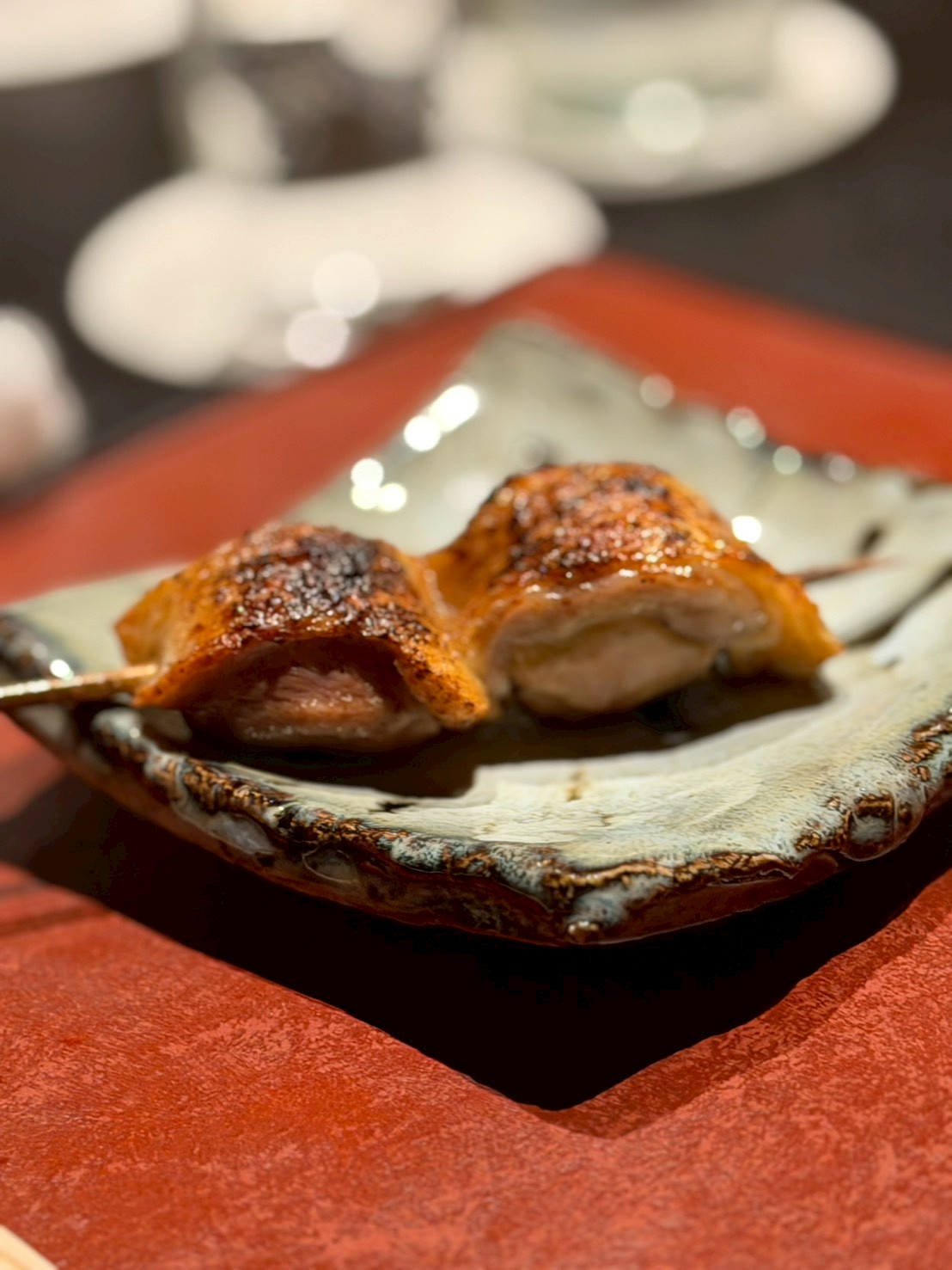 夏天的藤居最有名的是「炭火香魚」。他會用長針穿刺香魚,以「頭低尾高」的姿勢斜烤,讓魚本身的油脂流向魚頭,把魚頭烤得金黃酥脆。上桌前,還會用日本茶進行燻製,掀開蓋子時的茶香與炭火焦香,簡直是嗅覺的盛宴。