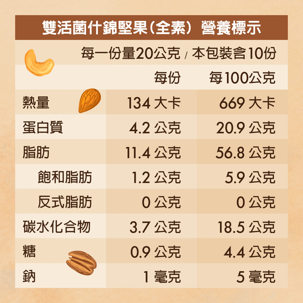 | 內容物名稱 | 腰果、核桃、杏仁、胡桃、開心果、雙活菌(燕麥粉、納豆菌發酵物、芽孢乳酸菌發酵物、麥芽糊精) |