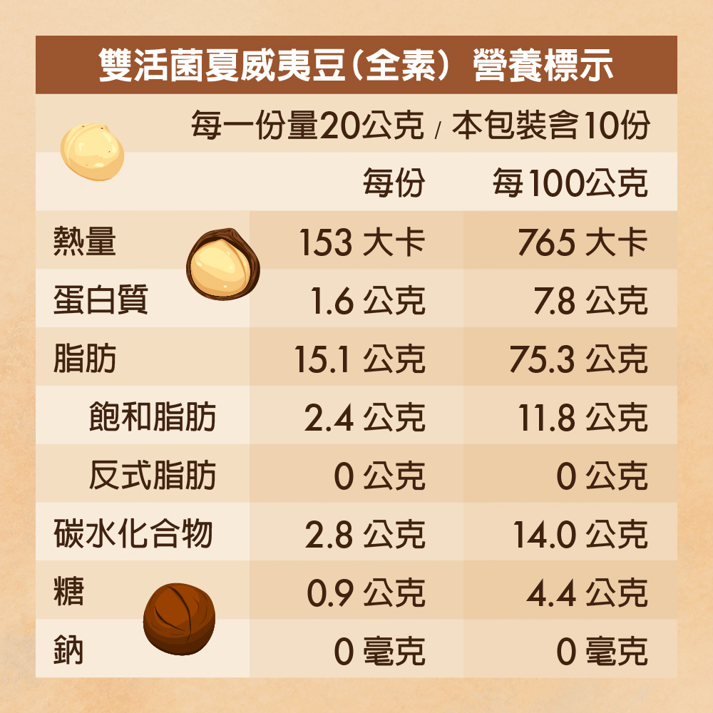 內容物名稱(成分):夏威夷豆、雙活菌(燕麥粉、納豆菌發酵物、芽孢乳酸菌發酵物、麥芽糊精)