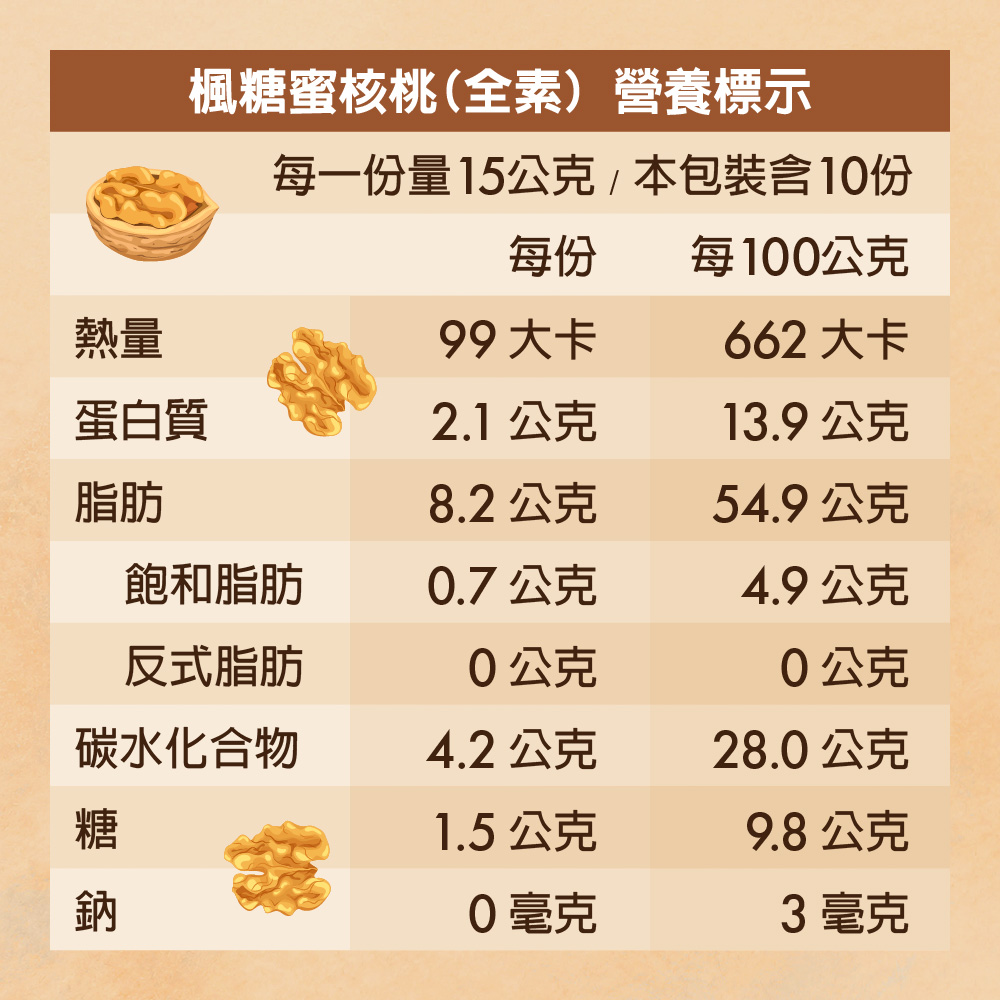 | 內容物名稱 | 核桃、砂糖、楓糖、麥芽糊精、麥芽糖漿、結蘭膠 |
