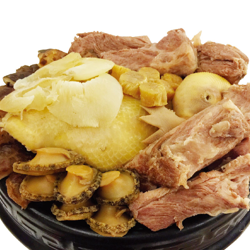 精選小土雞、上選魚翅、豬腩排、鮑魚、大干貝、花菇、以火腿高湯燉煮而成三味肉汁融合,湯清鮮甜。