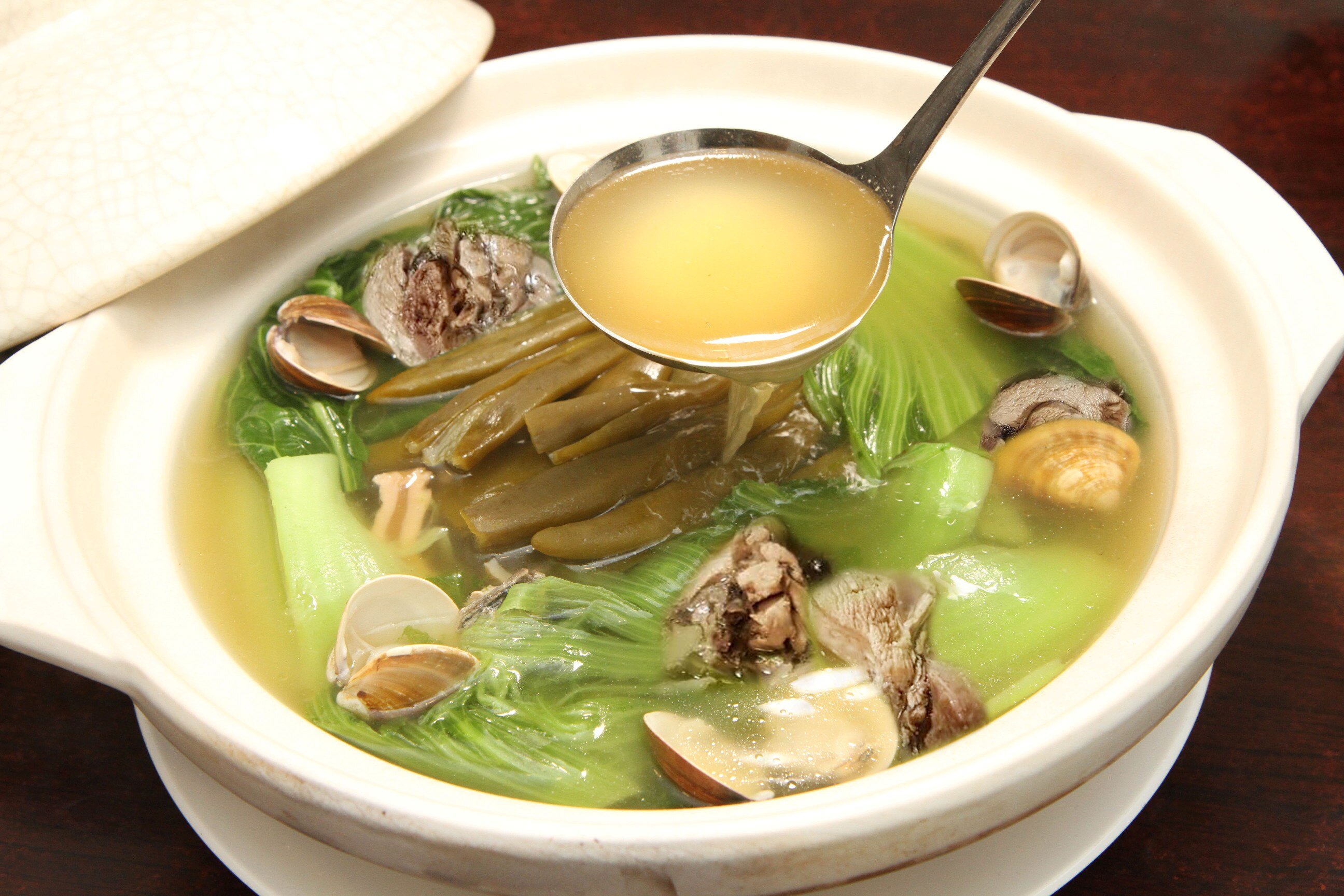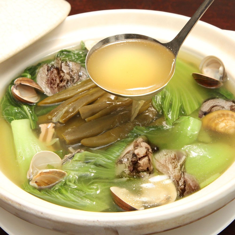 以蛤蜊、長年菜、剝皮辣椒、烏骨雞一起慢火熬煮的雞湯,清爽帶點剝皮辣椒香,肥美的蛤蜊在湯中盡放鮮甜,過年必吃的長年菜吸了滿滿的湯頭甜味,一定不能錯過這道「限定年菜」!