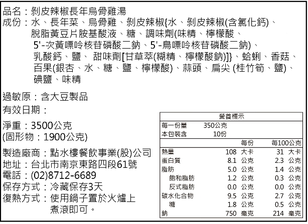 讓家中長輩也瘋狂的湯品-剝皮辣椒長年菜烏雞湯,是年節時分餐桌上不可缺少的一道料理。 ░ 出貨說明:下單後5個工作天內出貨。(不包含六、日) 可於備註欄指定5個工作天後的到貨日期,廠商將盡力配合。 最後接單日為2/3,出貨日為2/8,年前受限於宅配因素,到貨日可能延遲,無法保證除夕前到貨,請儘量指定較早的到貨日期。