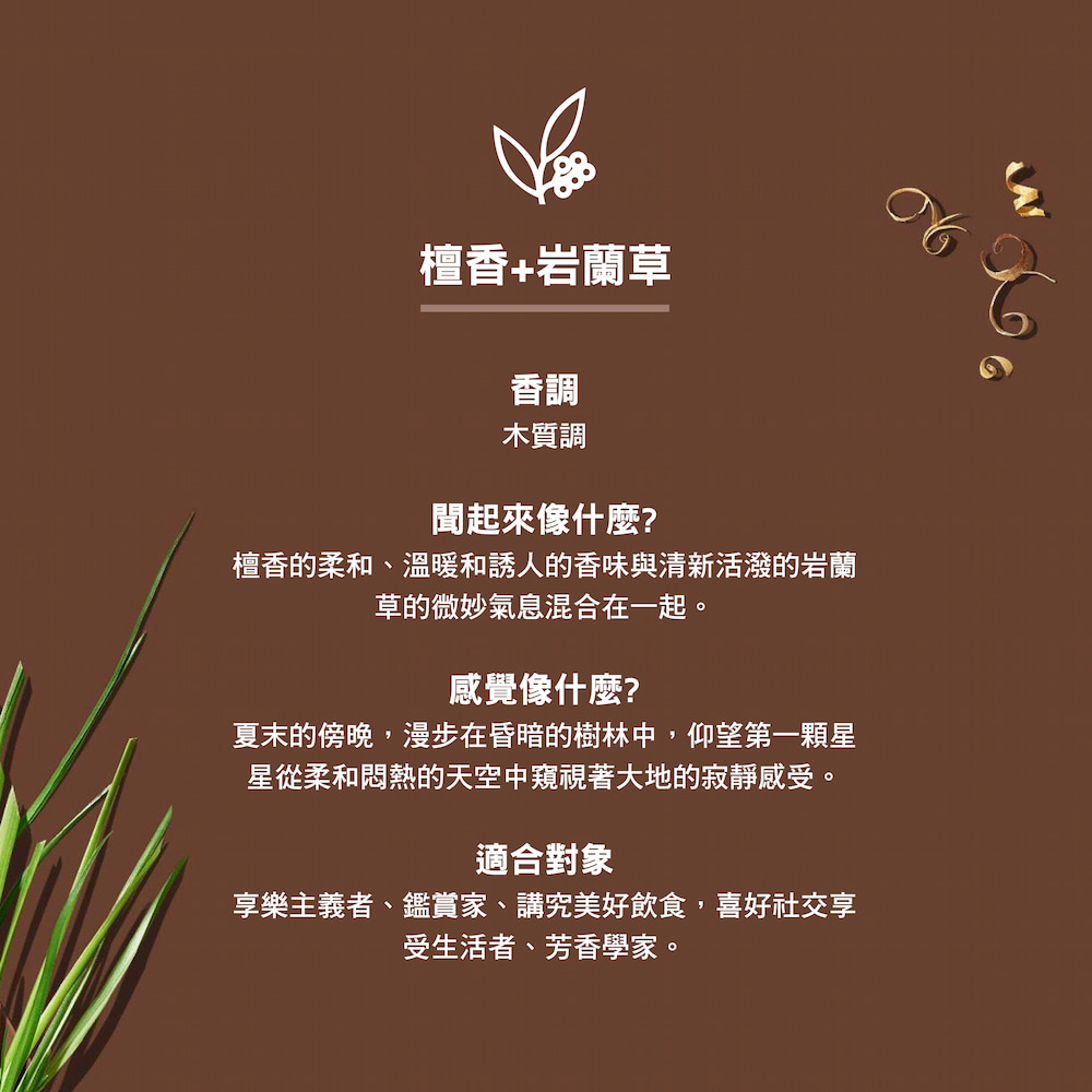 檀香的柔和、溫暖和誘人的香味與清新活潑的岩蘭草的微妙氣息混合在一起。