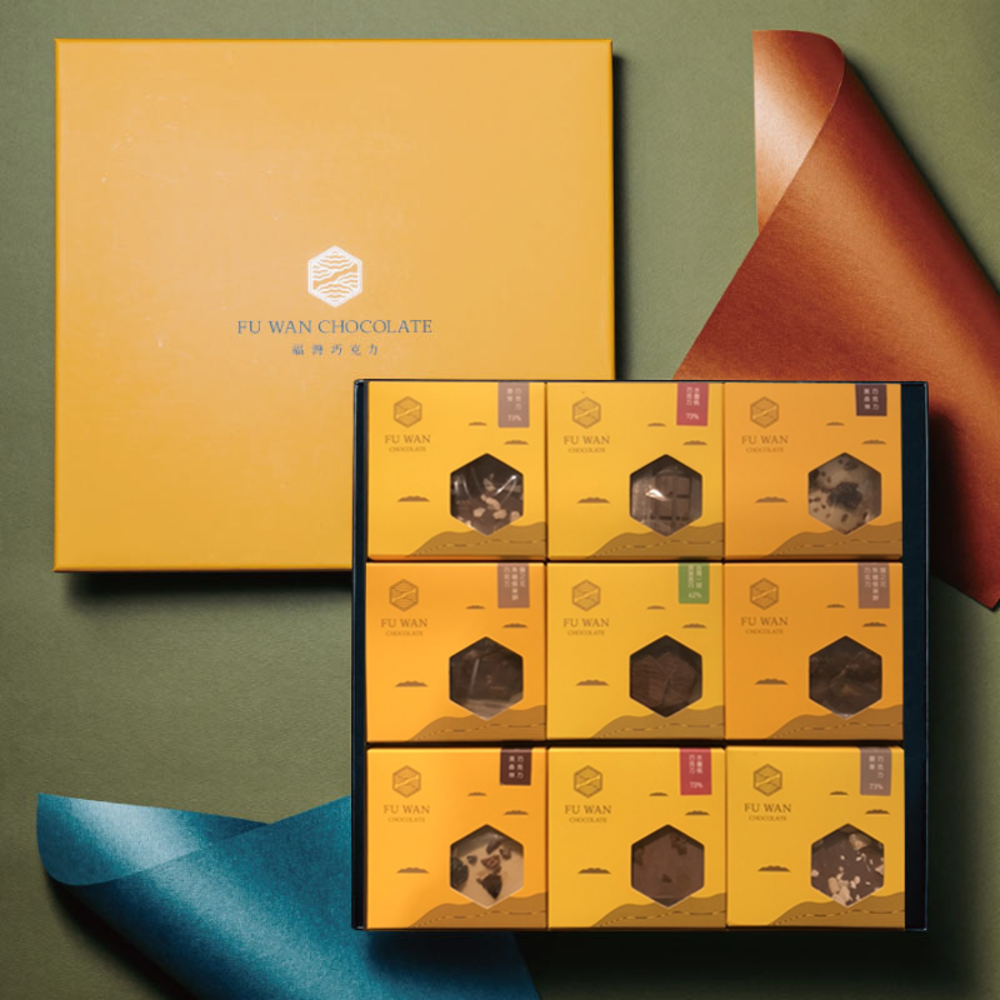 禮盒內容:九入禮盒,73%腰果巧克力-26gx2入,鹽花焦糖蜂巢餅-24gx2入,黑森林巧克力x2入-24gx2入,73%水蜜桃巧克力-13gx2入,62%台灣一號屏東黑巧克力薄片-27g。