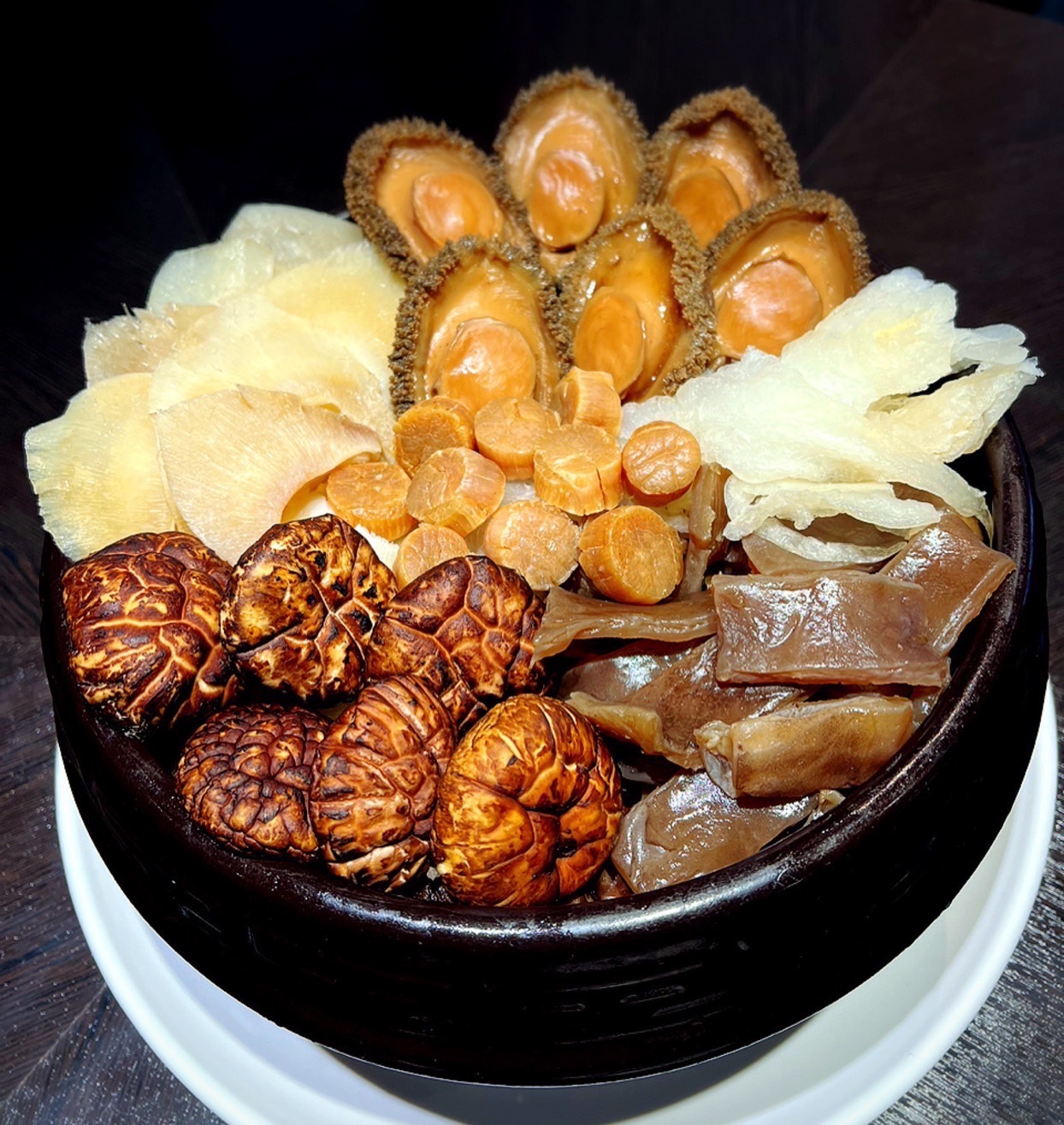 特頂級上選食材南非白鮑魚 、特選天勾翅、北海道元貝、黑玉蔘、極品花膠及特厚黑魚皮等以老母雞高湯精燉的米其林頂極湯品。