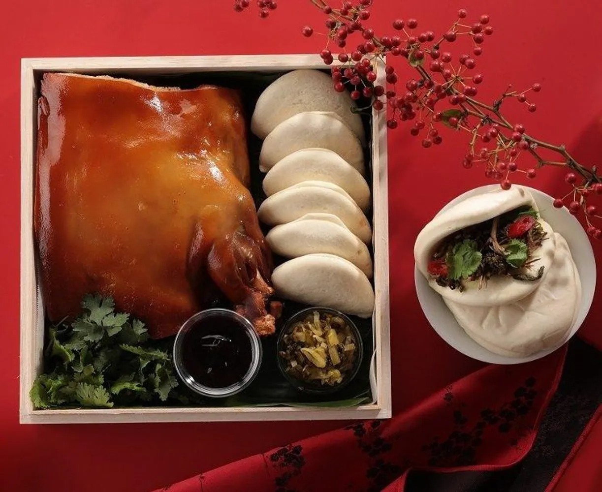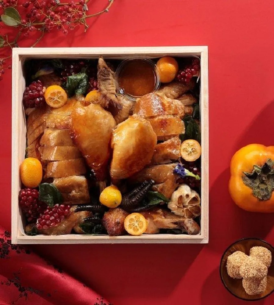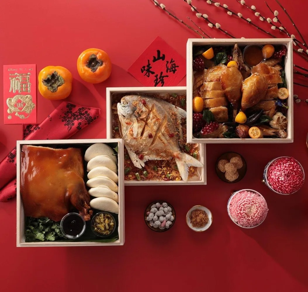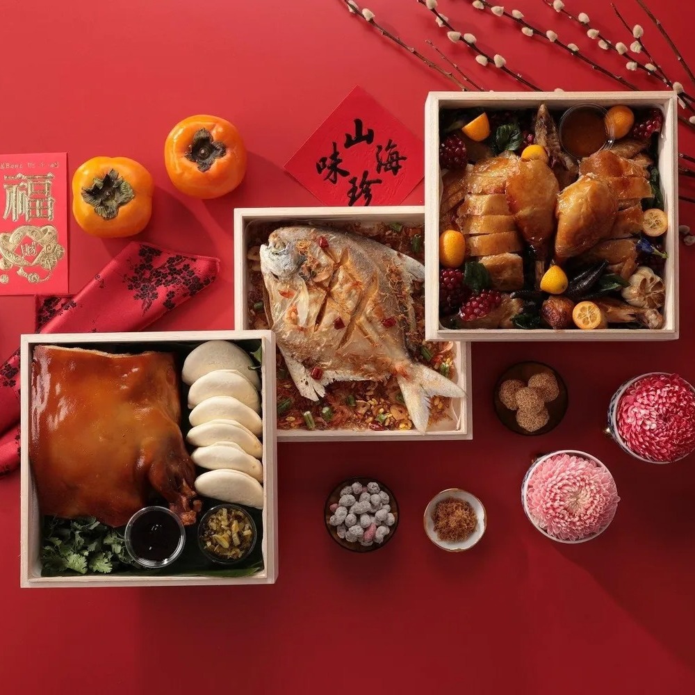 另一個團長要特別介紹的年菜是山海樓的三層珍寶盒特別版: 將傳統過年拜拜祭祖的三牲 華麗變身,變成了《金銀燒豬》《香酥白鯧》《招牌甘蔗雞》,三層錦盒裡還有很多其他配菜,絕對是體面又美味的年菜小心機。