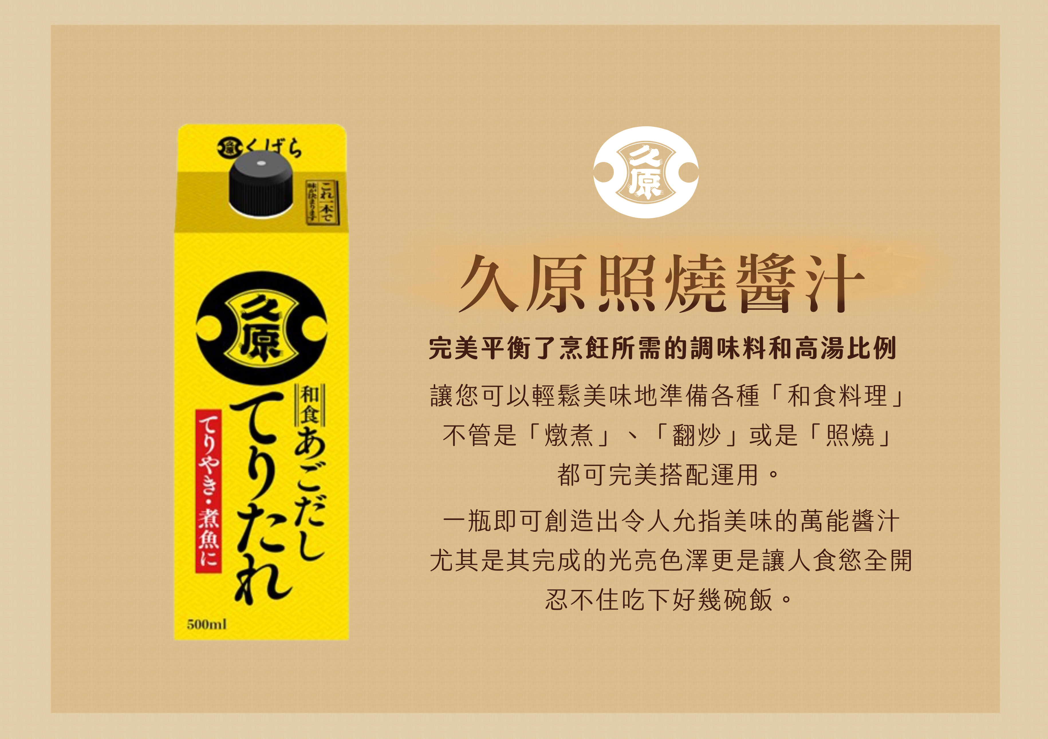 《久原照燒醬汁擁有絕佳湯頭、醬油、甜味的完美平衡,適用燉煮、炒菜、照燒各種料理》