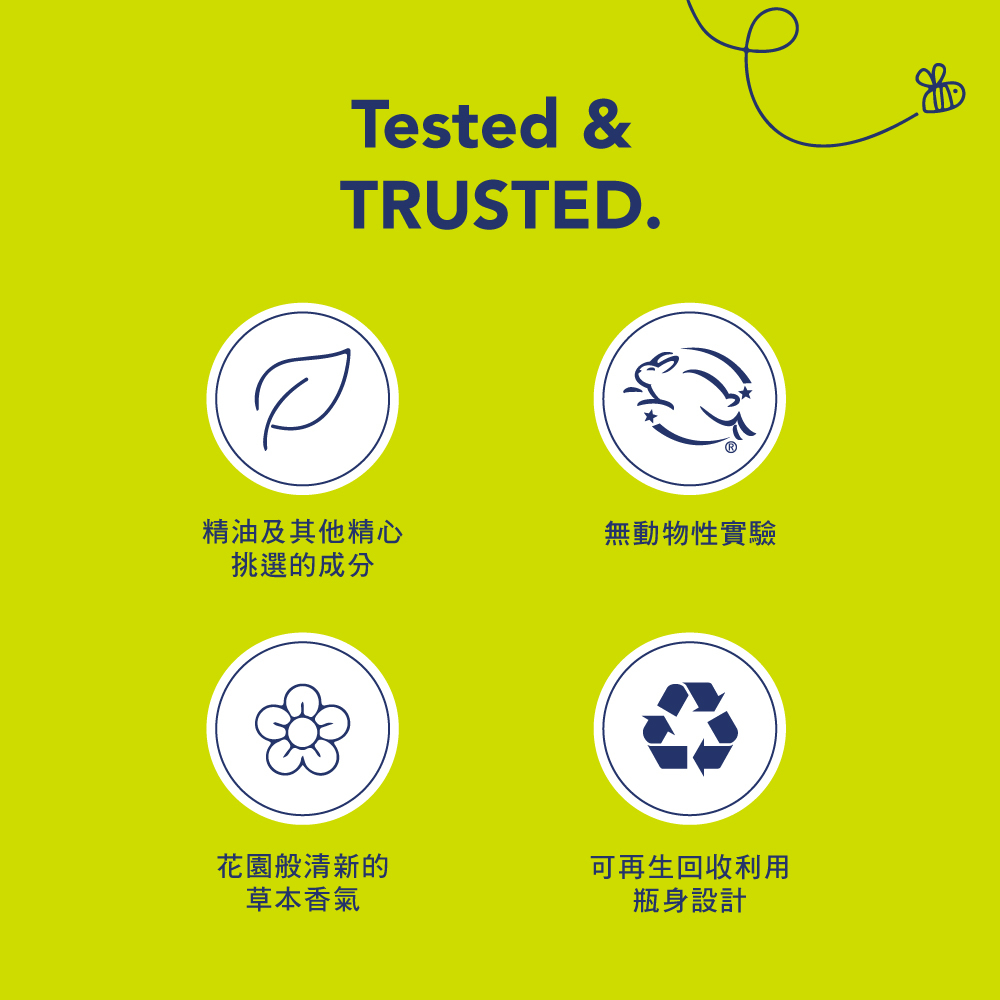 不含鄰苯二甲酸酯(Phthalates)、對羥基苯甲酸酯(parabens)、MEA&DEA及人工色素。不含任何有害化學物質,無刺激性,對家庭成員及寵物絕對安全。您可以安心使用,不必擔心化學成分的侵害。全成分零殘忍配方,愛護動物並獲得 Leaping Bunny 認證。環保再生回收塑料瓶身設計,可再生回收包裝設計,減少不必要的塑料使用。