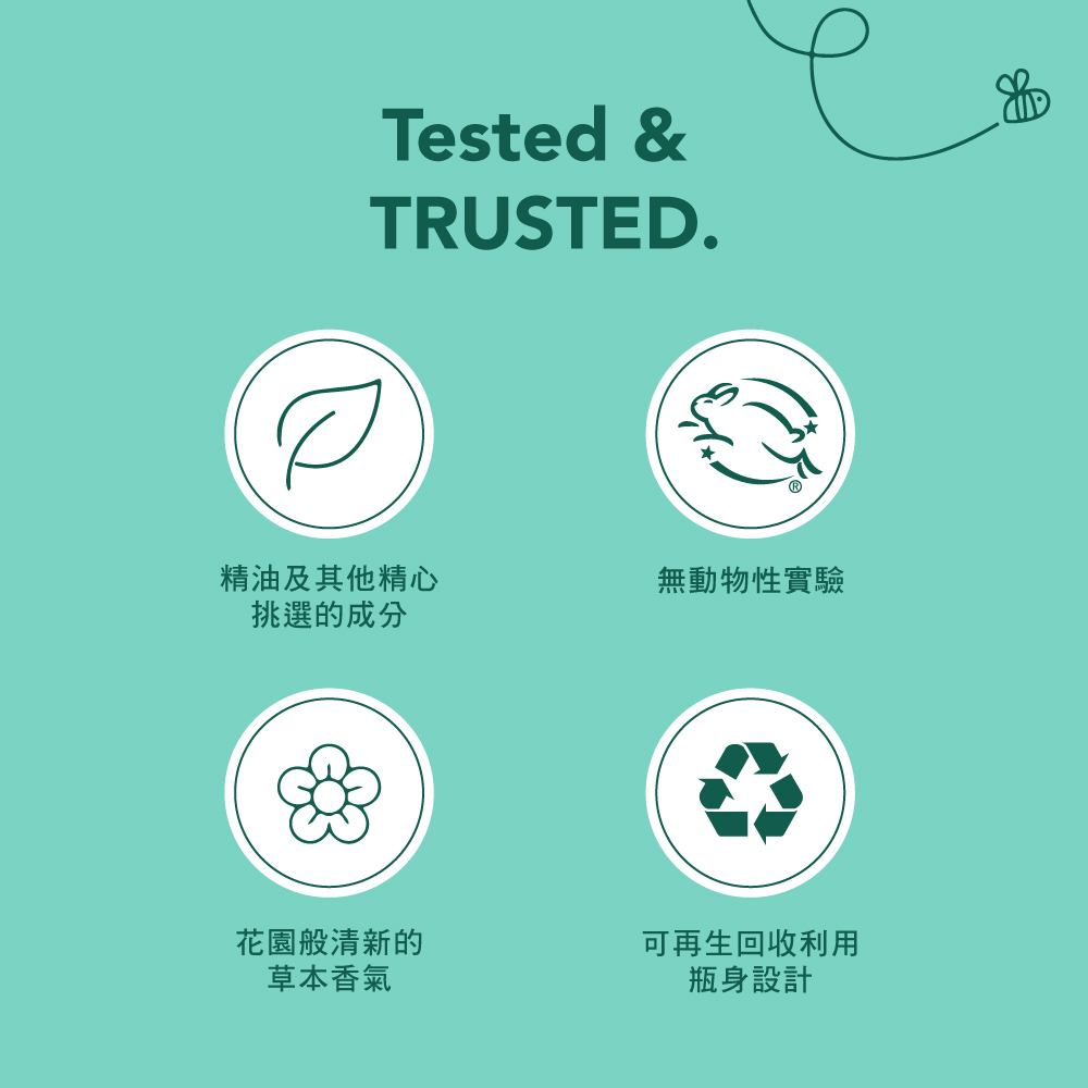 不含鄰苯二甲酸酯(Phthalates)、對羥基苯甲酸酯(parabens)、MEA&DEA及人工色素。不含任何有害化學物質,無刺激性,對家庭成員及寵物絕對安全。您可以安心使用,不必擔心化學成分的侵害。全成分零殘忍配方,愛護動物並獲得 Leaping Bunny 認證。環保再生回收塑料瓶身設計,可再生回收包裝設計,減少不必要的塑料使用。