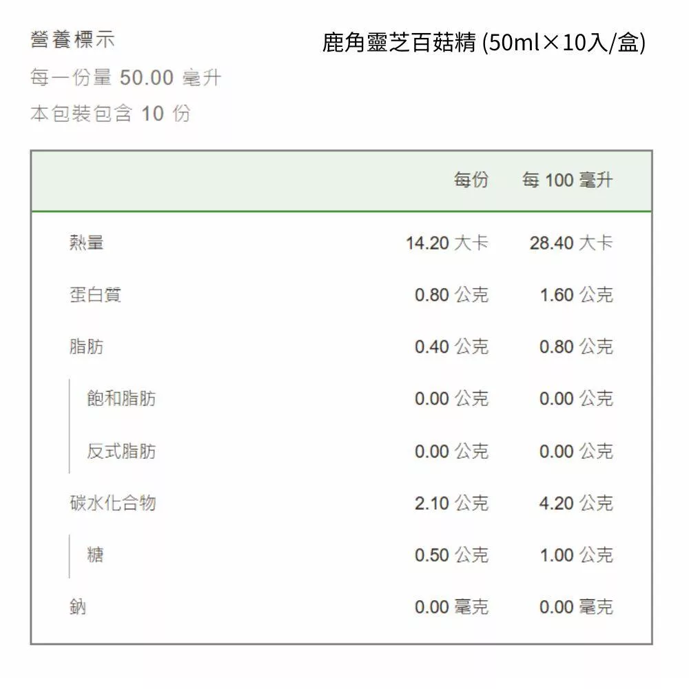 內容物名稱:綜合菇萃取液(水、秀珍菇、舞菇、金針菇、杏鮑菇、香菇、白木耳)、巴西蘑菇子實體萃取粉[ 巴西蘑菇子實體萃取粉(Agaricus blazei Murill,固體培養)、麥芽糊精]、鹿角靈芝子實體萃取液{鹿角靈芝子實體[Ganoderma lucidum(Antler)],固體培養}、純水。
