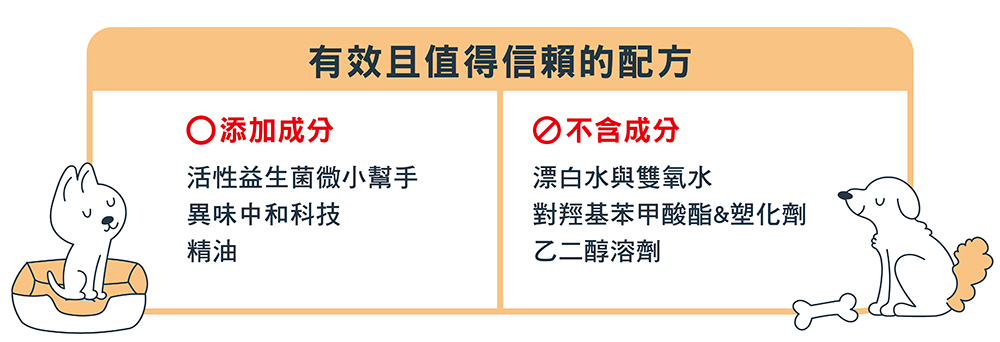 精心添加益生菌微小幫手,在微細的表面持續深層清潔,並搭配除臭科技,從源頭對抗寵物氣味與異味,而非僅僅以香味掩蓋。