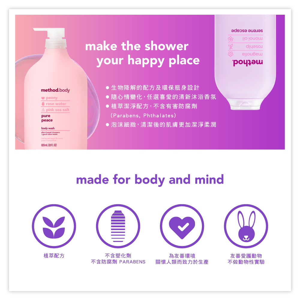 - 中文品名:Method 美則 感官沐浴乳 – 純靜花語