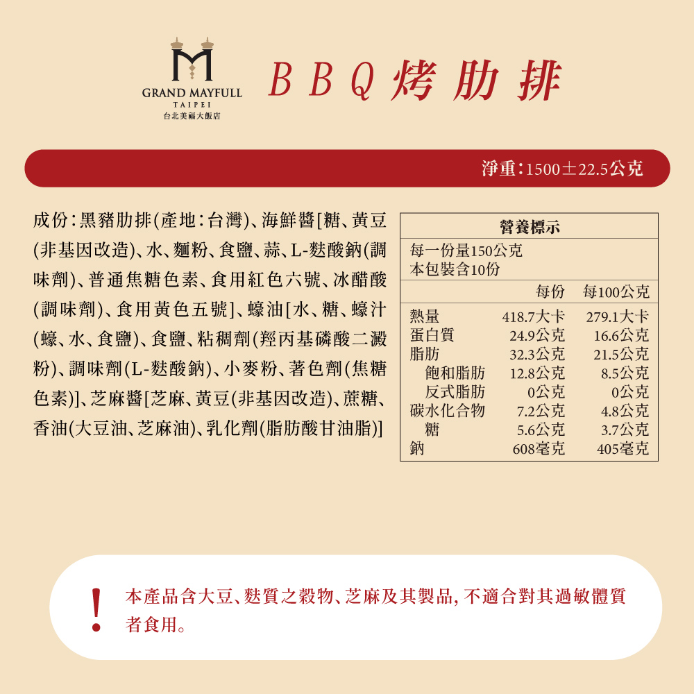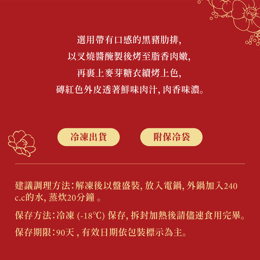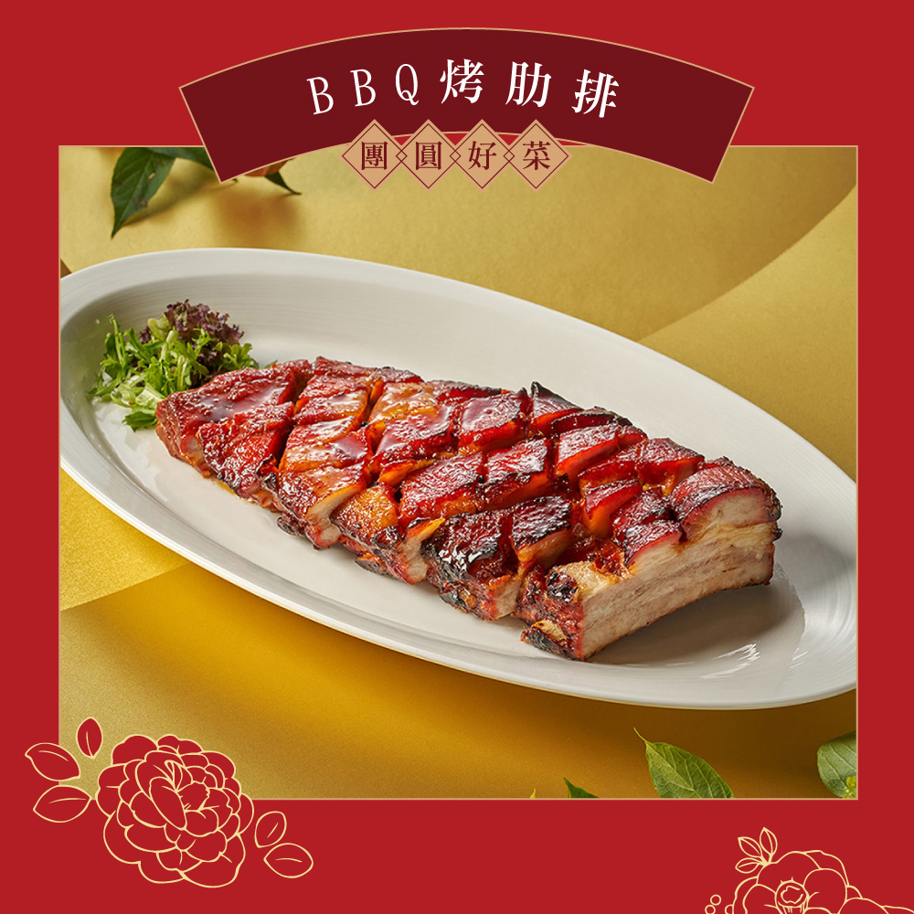 選用帶有口感的黑豬肋排,以叉燒醬醃製後烤至脂香肉嫩,再裹上麥芽糖衣續烤上色,磚紅色外皮透著鮮味肉汁,肉香味濃。