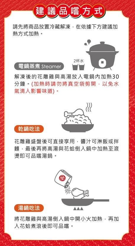 🥢 加湯變火鍋:加入喜愛的蔬菜、豆腐或麵條,吸飽花雕酒香與花蛤鮮汁,暖心又飽足。