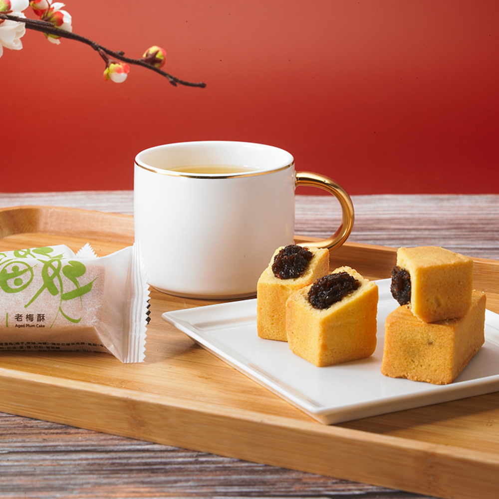 - 老梅酥成分:老梅鳳梨餡【陳年釀漬梅(梅子、蔗糖、海鹽)、陳年巴薩米克醋、鳳梨、冬瓜、無水奶油、麥芽糖】、麵粉、奶油、蛋、糖、奶粉、葡萄糖|淨重:35g/個|規格:3個|保存期限:45天(未開封常溫下)