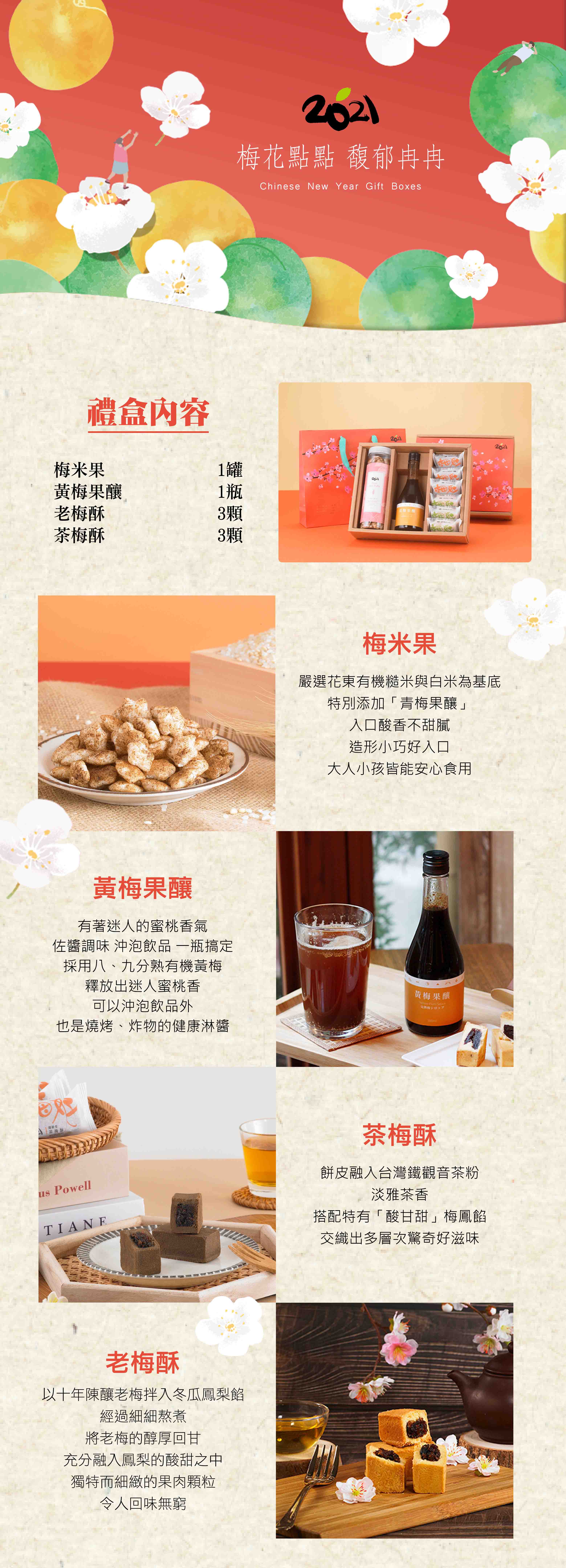 - 茶梅酥成分:老梅鳳梨餡[陳年釀漬梅(梅子,蔗糖,海鹽)、冬瓜醬(冬瓜,麥芽糖,砂糖,食鹽)、鳳梨醬(冬瓜,鳳梨,麥芽糖,砂糖,無水奶油,食鹽)、巴薩米克醋(葡萄酒醋,葡萄果漿)]、麵粉、糖、蛋黃、奶油、奶粉、鐵觀音茶粉、鹽|淨重:35g/個|規格:3個|保存期限:60天(未開封常溫下)
