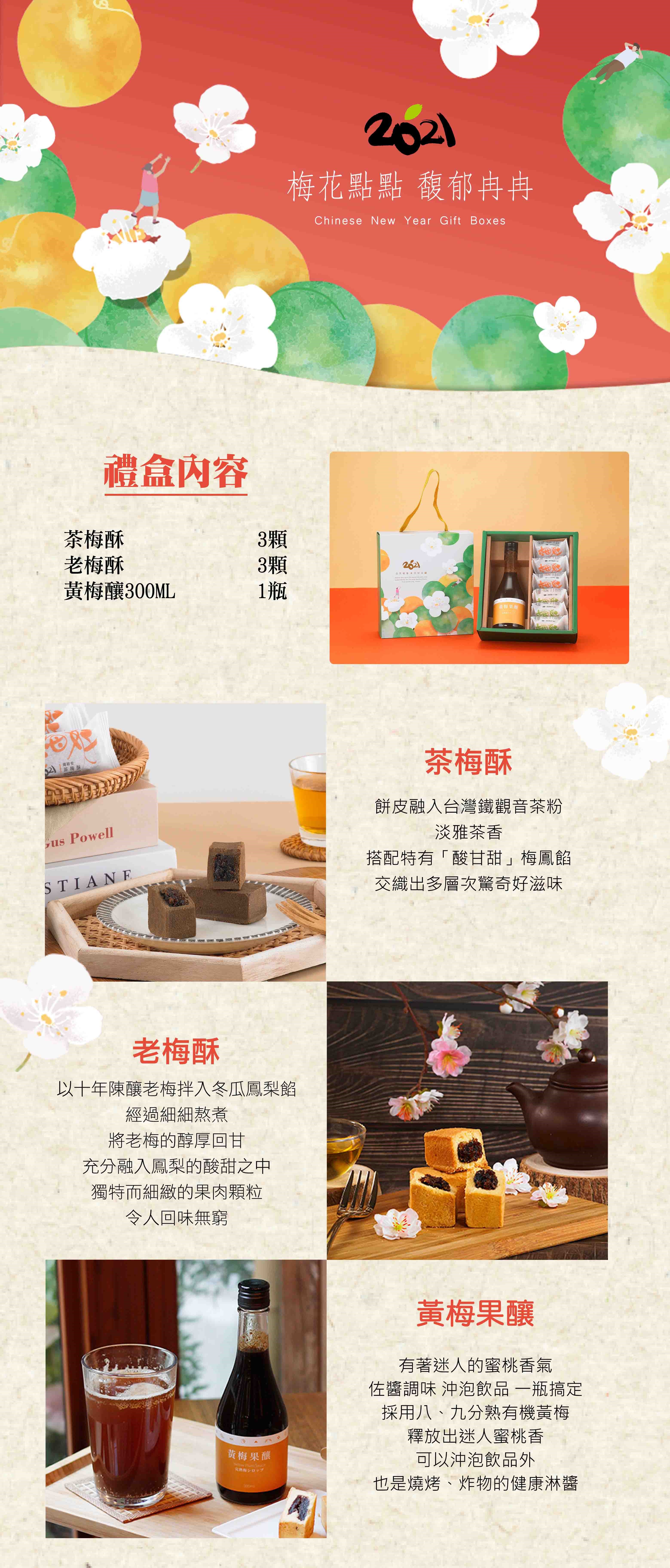 - 茶梅酥成分:老梅鳳梨餡[陳年釀漬梅(梅子,蔗糖,海鹽)、冬瓜醬(冬瓜,麥芽糖,砂糖,食鹽)、鳳梨醬(冬瓜,鳳梨,麥芽糖,砂糖,無水奶油,食鹽)、巴薩米克醋(葡萄酒醋,葡萄果漿)]、麵粉、糖、蛋黃、奶油、奶粉、鐵觀音茶粉、鹽|淨重:35g/個|規格:3個|保存期限:60天(未開封常溫下)