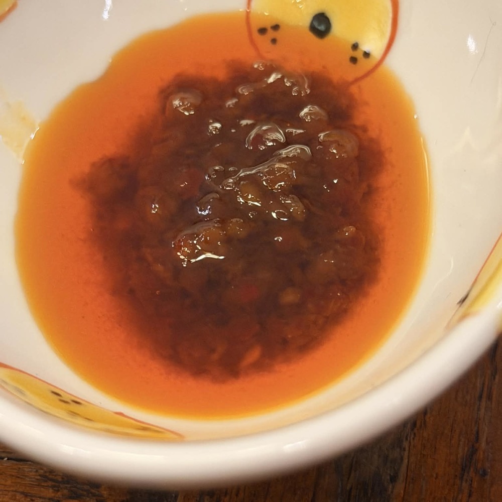 團長非常認真試吃了這個拌拌醬,入口先是海鮮和蒜酥的鮮甜,醬裡還保留了些原食材的質地,咬得到小蝦的香氣,有點沙茶或沙嗲的聯想,但又不只於此,有個熟悉的果香貫穿這些味道,原來是鳳梨!所以它先甜後辣的味道非常自然,雖然味道濃厚,卻一點也不膩人。