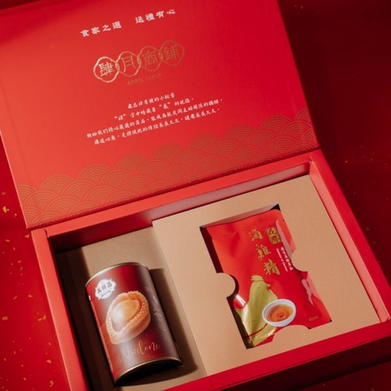 肆月商鋪將香港百年老字號 「萬順昌皇金鮑」 與 「花膠滴雞精」 精心結合, 打造尊貴且滋養的禮饌,完美呈現補養、體面與心意的三重價值。