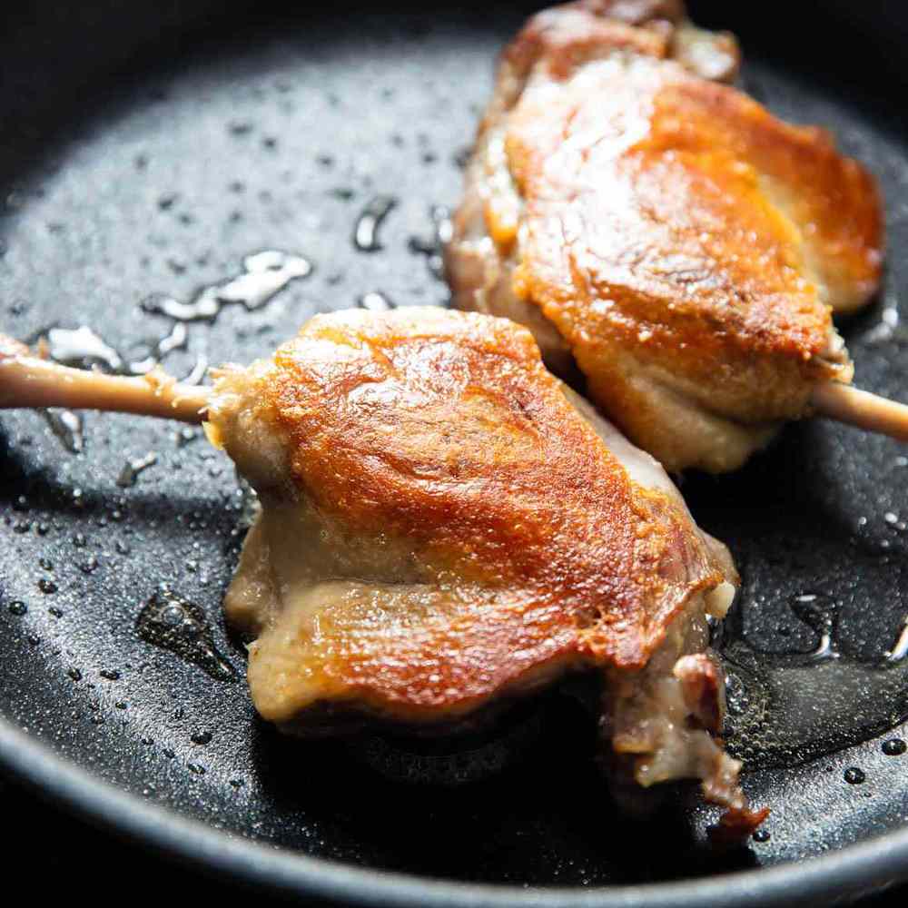 從鴨油中取出後,用平底鍋煎至皮脆金黃。