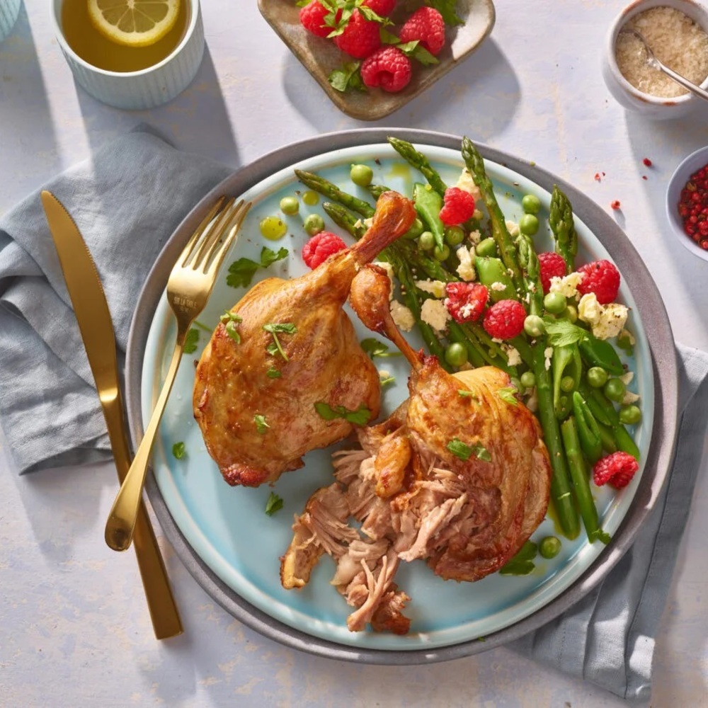 鴨肉香氣濃郁,肉質細膩多汁,鴨油帶有堅果與草本香氣,外皮酥脆、內裡柔軟。