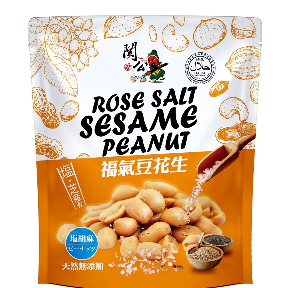 福氣豆花生,「一口福氣,滿滿好運!」,完美結合傳統花生的純粹滋味與芝麻的香濃層次,再以天然玫瑰鹽點綴,讓每一口都鹹香恰到好處,滿載幸福的味道。