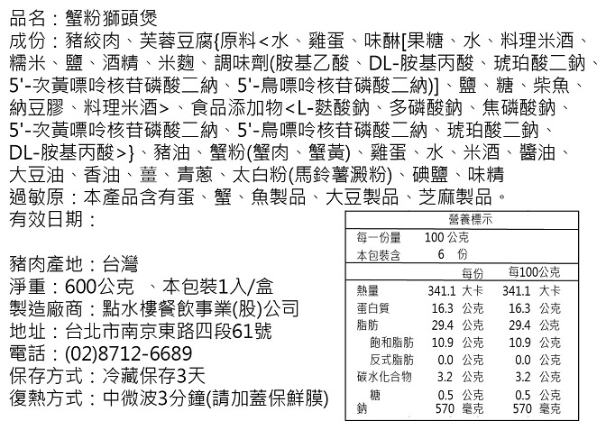手工拆蟹,以蟹肉、蟹膏、蟹黃炒製而成蟹粉,與手工製作獅子頭結合,獅子頭大顆飽滿肉質細嫩。 ░ 出貨說明:下單後5個工作天內出貨。(不包含六、日) 可於備註欄指定5個工作天後的到貨日期,廠商將盡力配合。 最後接單日為2/8,出貨日為2/11,年前受限於宅配因素,到貨日可能延遲,無法保證除夕前到貨,請儘量指定較早的到貨日期。