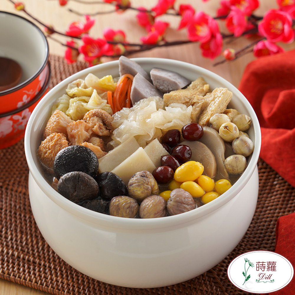 蒔蘿香草研發的「蒔蘿香草蔬食佛跳牆」,嚴選猴頭菇及有機白木耳、美白菇、香菇、栗子等食材,以細火慢熬出時蔬的鮮甜,清爽不油膩,每一口都是山珍海味的精華。過年圍爐的好選擇!
