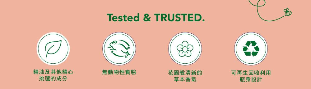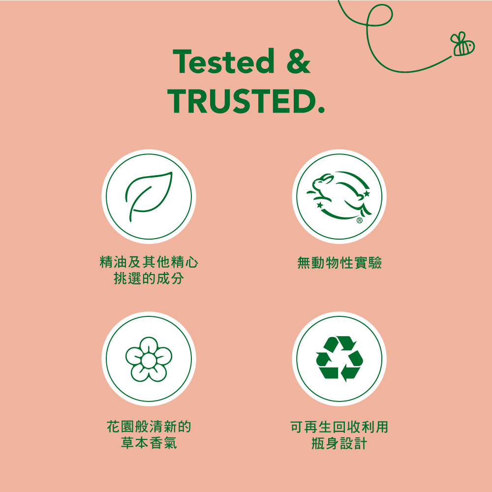 不含鄰苯二甲酸酯(Phthalates)、對羥基苯甲酸酯(parabens)、MEA&DEA及人工色素。不含任何有害化學物質,無刺激性,對家庭成員及寵物絕對安全。您可以安心使用,不必擔心化學成分的侵害。全成分零殘忍配方,愛護動物並獲得 Leaping Bunny 認證。環保再生回收塑料瓶身設計,可再生回收包裝設計,減少不必要的塑料使用。