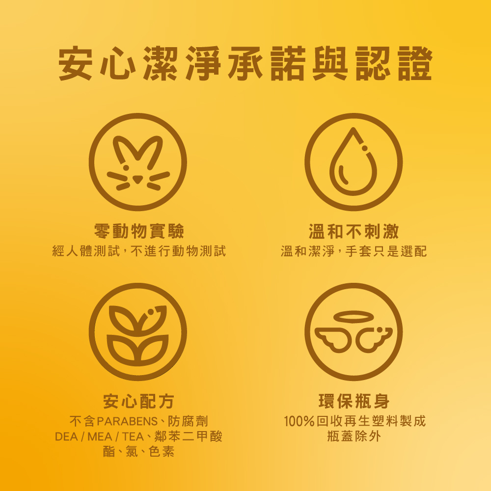 蛋白質 → 蛋白酵素(Protease) - 強效潔淨 + 溫和親膚 溫和不刺激雙手,洗碗可不需戴手套,產品不含 Parabens、Phthalates、Phosphates、DEAs、人工色素,無動物實驗(cruelty free)