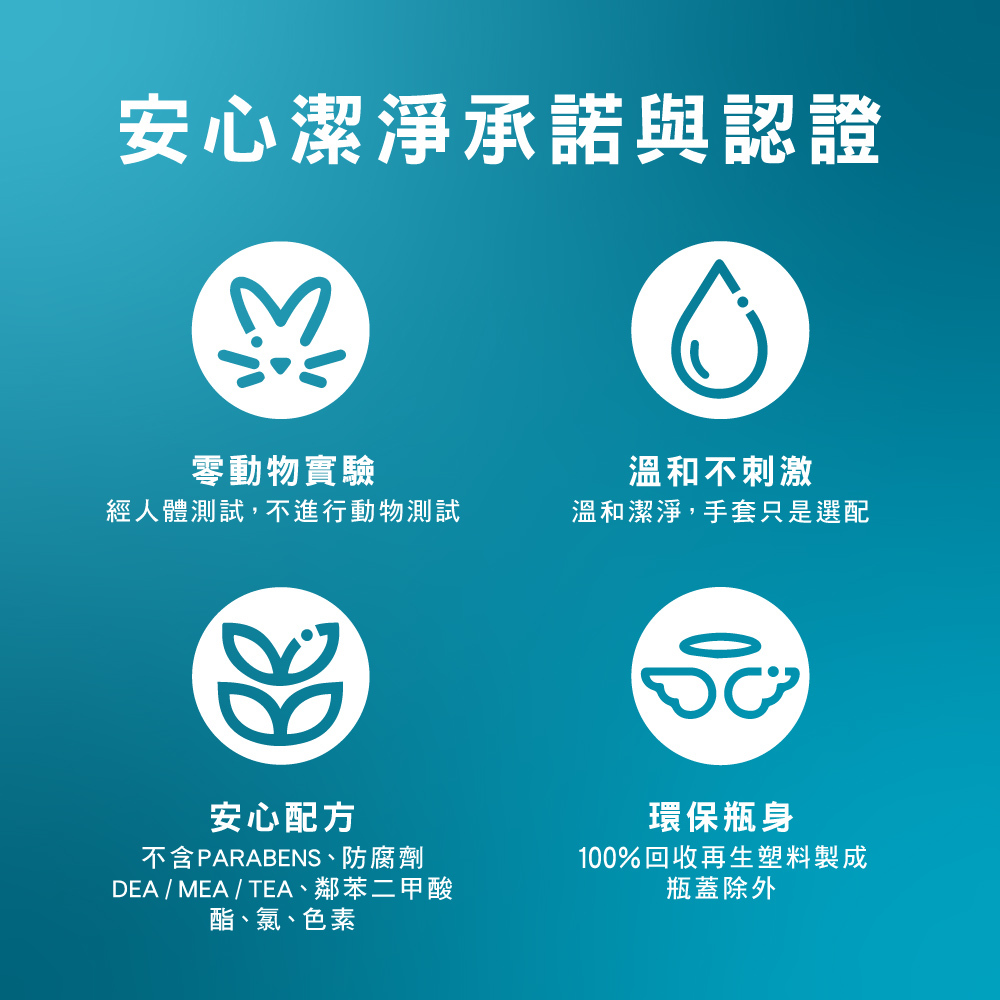 蛋白質 → 蛋白酵素(Protease) - 強效潔淨 + 溫和親膚 溫和不刺激雙手,洗碗可不需戴手套,產品不含 Parabens、Phthalates、Phosphates、DEAs、人工色素,無動物實驗(cruelty free)